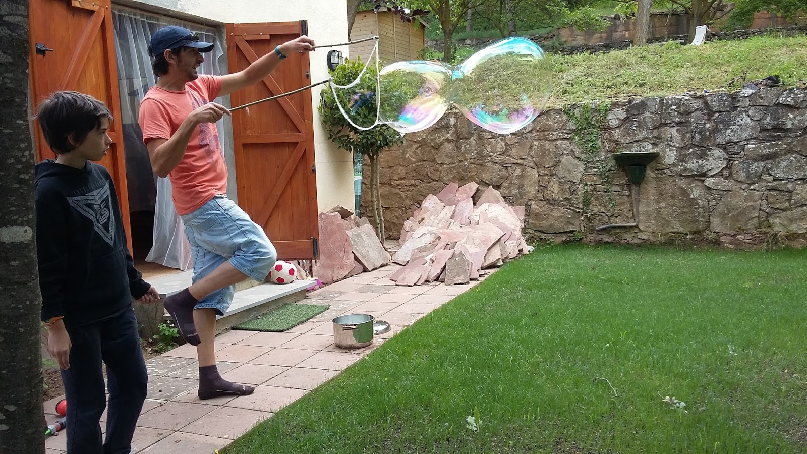 Ya tenemos la mezcla preparada para hacer burbujas gigantes , la formula sacada de internet nos ha funcionado . Y mirad que bien se lo pasan ...